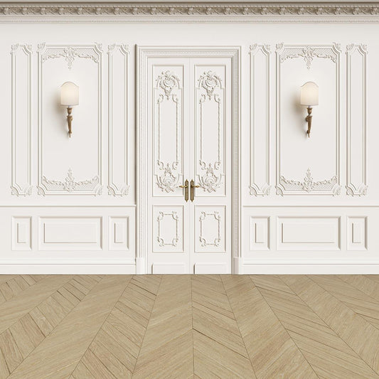 Luxurious White Wall Door Wedding Light Brown Wood Floor Backdrop for Photo