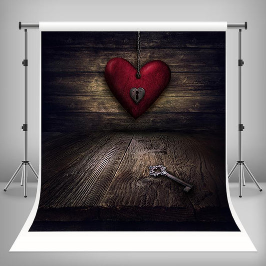 Red Love Heart and Dark Brown Wood Floor Backdrop Photography Background