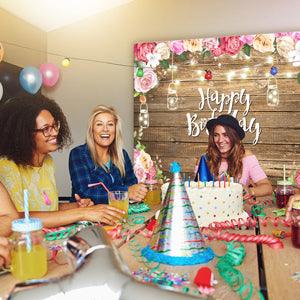 Happy Birthday Flower Decoration Romantic Wood Texture Photography Backdrop for Studio